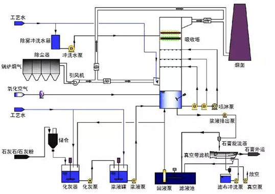 湿式石灰烟气脱硫工艺流程主要由石灰浆液制备系统、SO2吸收,氧化系统、烟气系统和石膏脱水系统组成。